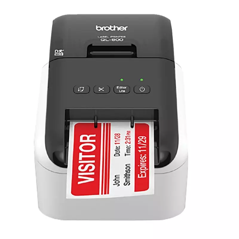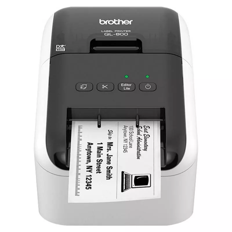 Impresora de etiquetas Brother QL-800 profesional de alta velocidad para emprender proyectos de etiquetado en oficinas, comercios, showrooms y más. Creá etiquetas llamativas con texto negro y rojo con la cinta DK-2251 o con nuestras rentables etiquetas de papel para paquetes, sobres, carpetas de archivos, insignias de identificación, logos y más. Para ayudar a ahorrar tiempo, esta máquina súper rápida imprime hasta 93 etiquetas estándares por minuto en texto negro a 300 dpi, y viene con una cortadora automática para imprimir 1 o múltiples etiquetas a la vez.